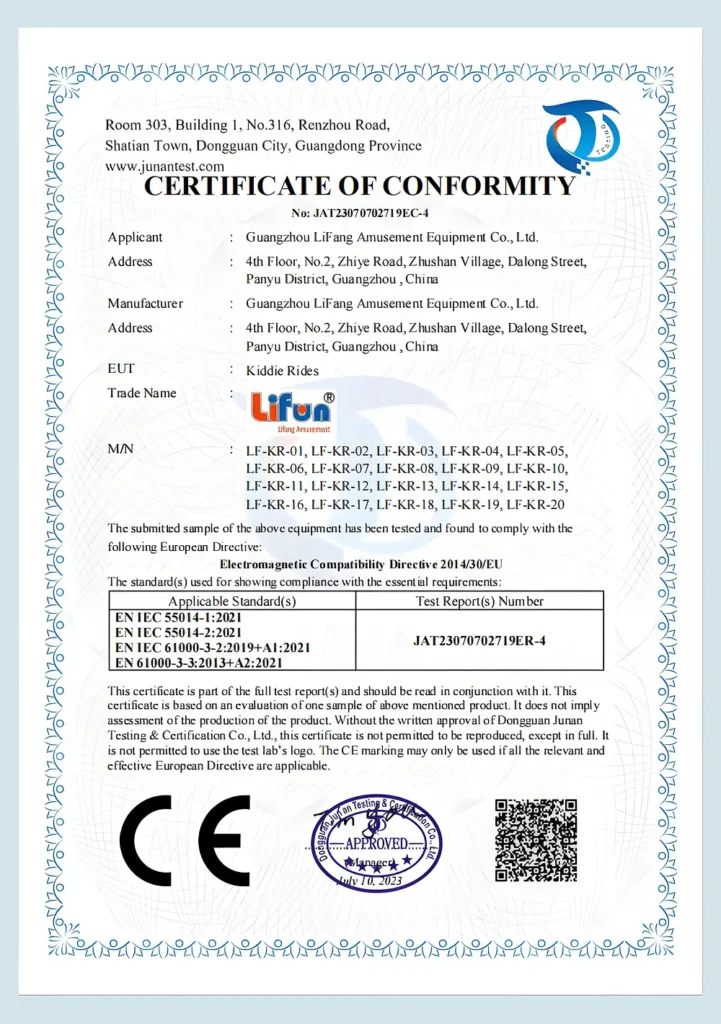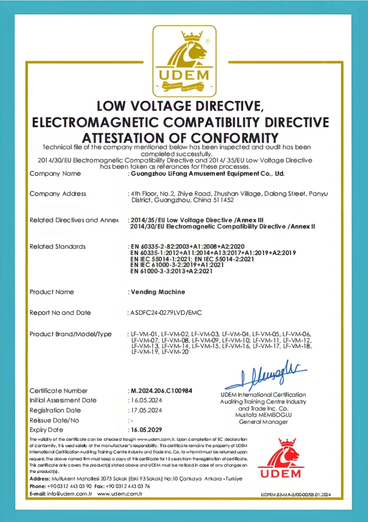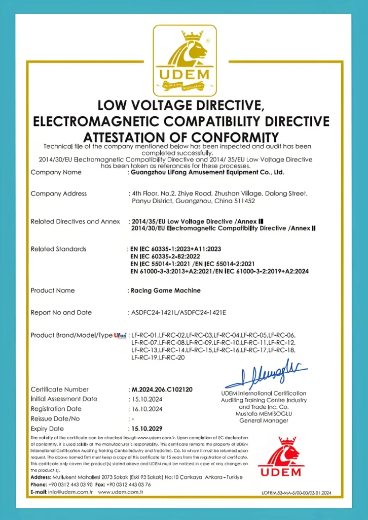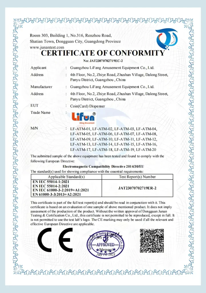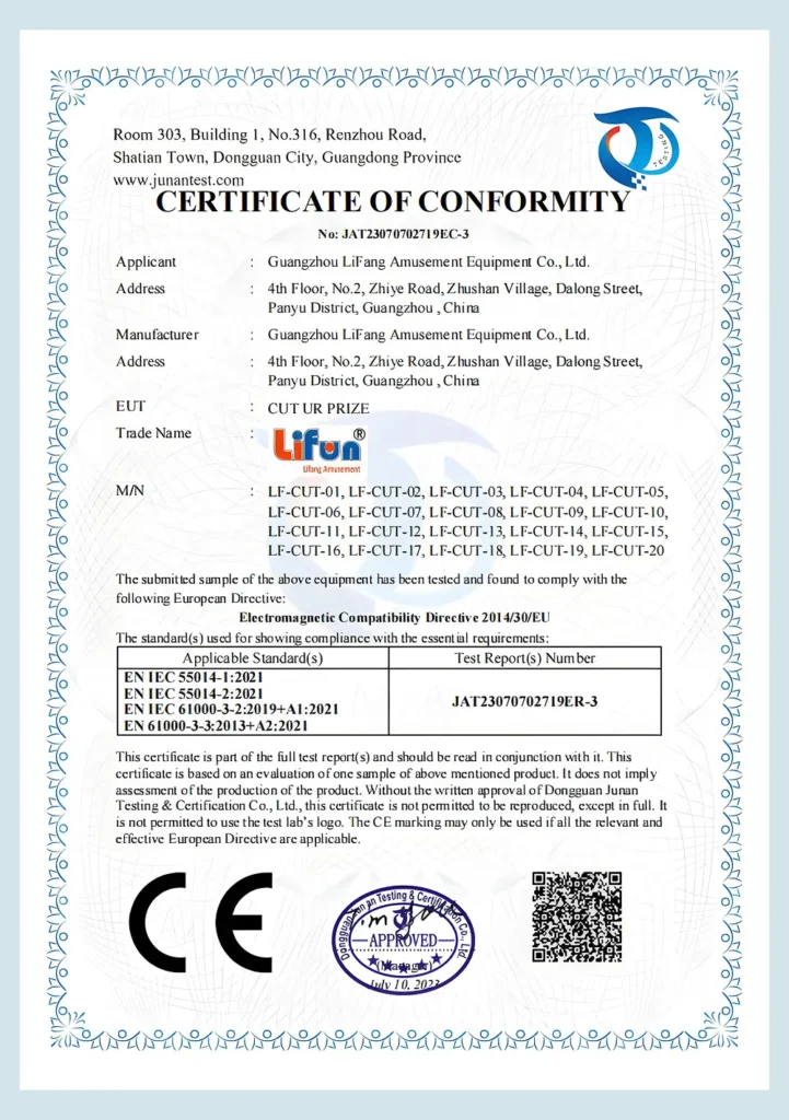 At Lifun Arcade Game, we are committed to delivering products that meet the highest international standards. This page showcases our official certifications, including CE, EMC, and IAAPA membership, demonstrating our dedication to quality, safety, and compliance across all arcade and vending machines.