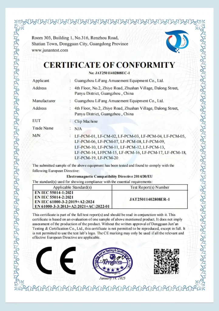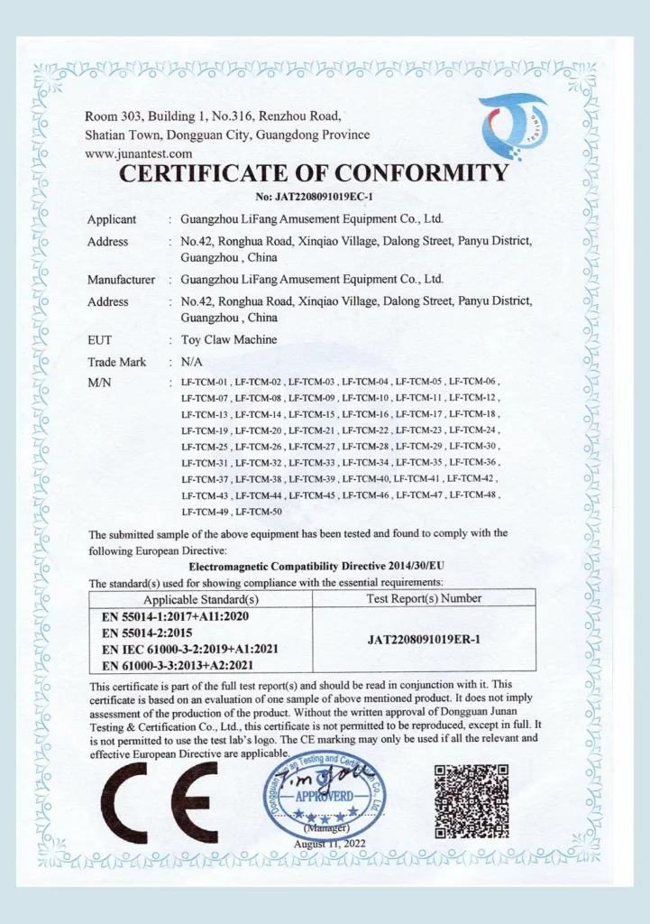 EU-certified electromagnetic compatibility certificate for our range of clip arcade machines.