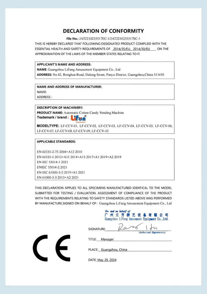 CE Declaration – Cotton Candy Vending Machine