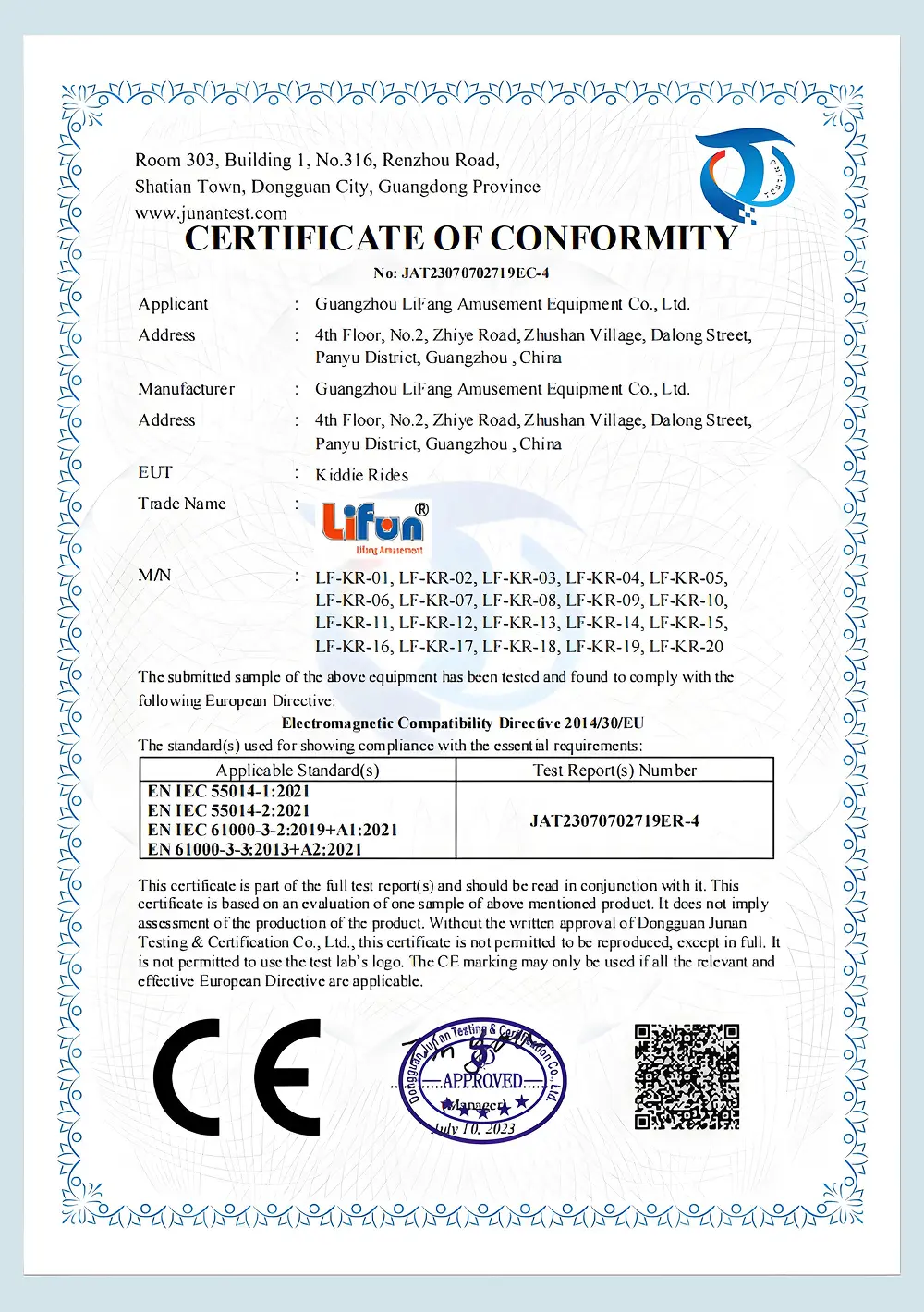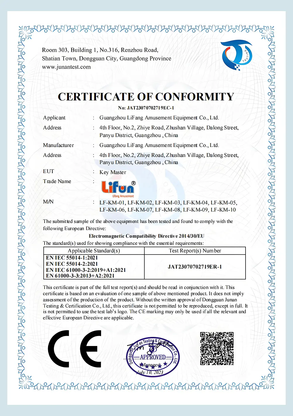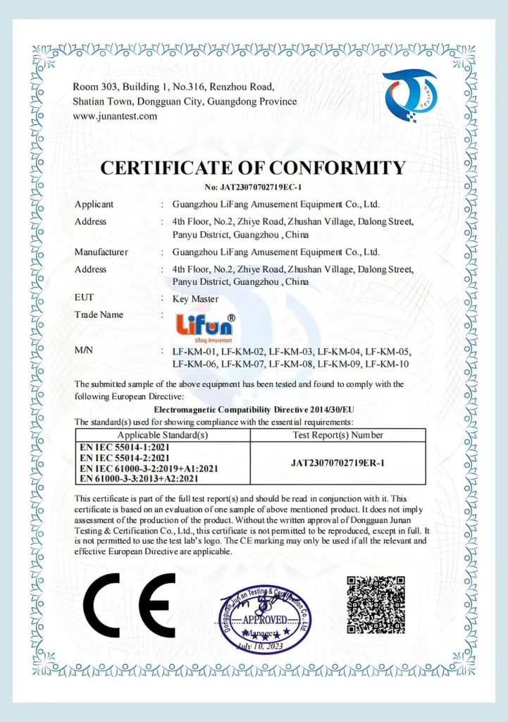 EU-approved CE conformity certificate for our Key Master arcade series under Lifun brand.