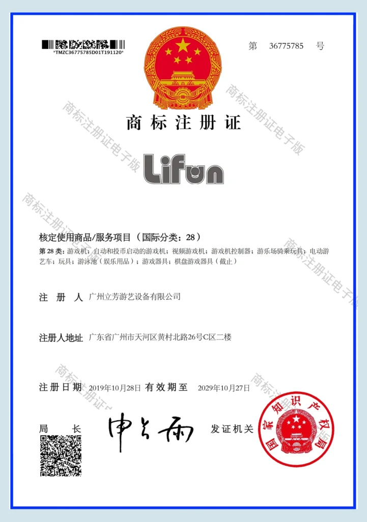 Official registration certificate of Lifun® trademark, legally protecting our brand under China’s intellectual property law.